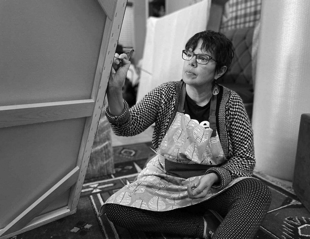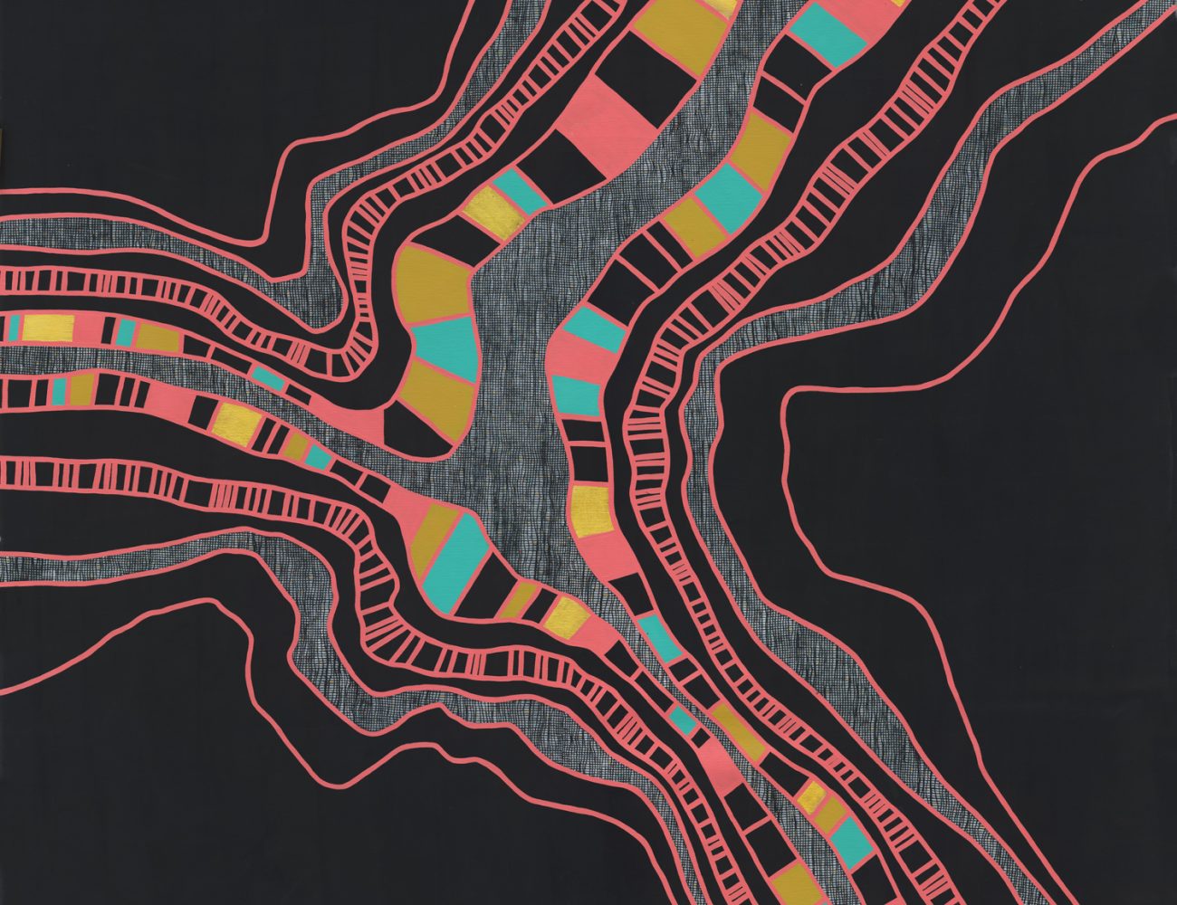 Her artwork captures our evolving journey, rivers symbolising growth and connection, and flowing lines and squares representing the diverse, interconnected stories of our people.